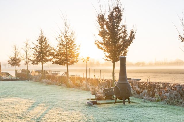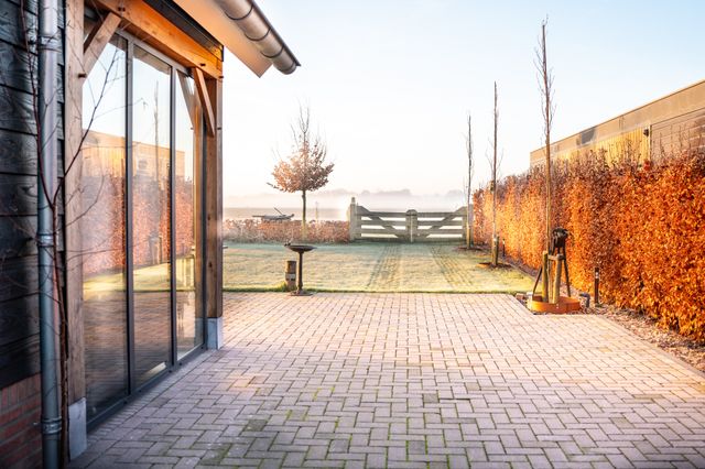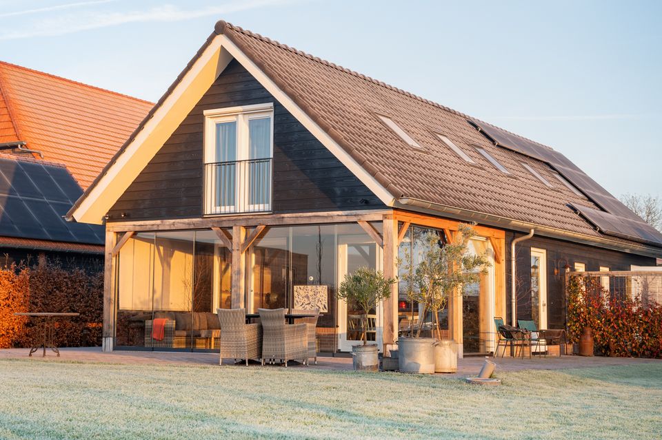 Er zijn openslaande tuindeuren in de overkapping met glazen schuifwand direct aan de tuin met uitzicht op het grasland, akkerland en het bos. In de tuin is een buitenkachel aanwezig.