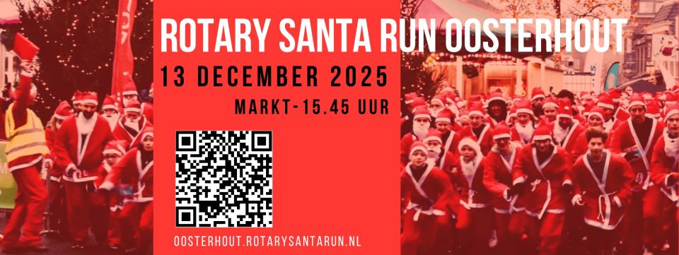 Zaterdag 13 december kleurt de Oosterhoutse binnenstad weer rood! Honderden kerstmannen, -vrouwen en -kinderen komen in beweging tijdens de 11e Rotary Santa Run Oosterhout. Deze gezellige kersttraditie brengt jong en oud samen om te lopen voor het goede doel. De gezamenlijke warming-up, de sfeervolle winterse Markt... de Santa Run belooft opnieuw een middag vol plezier, saamhorigheid en kerstmagie te worden. Noteer alvast 13 december in je agenda! Steun met jouw kerststappen een goed doel Santa Run Oosterhout draait om meer dan alleen gezelligheid. Deelnemers lopen voor goede doelen. Dit jaar zijn dat: Musicalvereniging Con Brio, Inloophuis Poppy’s, Wensboom Oosterhout, Senioren Collectief Oosterhout, Zoldertjater en het mgr. Frencken College (Inloophuis voor alleenstaande moeders in Nepal). Bij inschrijving kies je zelf welk doel je wil helpen. Zo weet je precies welk doel je met jouw kerststappen helpt. Rotaryclub Oosterhout Regio, hoofdsponsor Geerts en vele sponsoren en vrijwilligers hopen ook dit jaar weer een zee van rode kerstpakken door de stad te zien trekken. Winterse gezelligheid op de Markt In december verandert de Oosterhoutse Markt opnieuw in de sfeervolle IJsmarkt. Op 13 december vormt deze winterse locatie het hart van de Santa Run, met volop muziek, gezelligheid en natuurlijk: kerstmannen! Programma