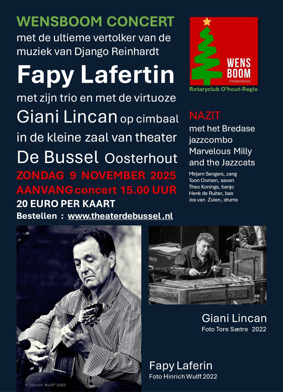Op zondagmiddag 9 november 2025 wordt de kleine zaal van Theater De Bussel in Oosterhout gevuld met de klanken van zigeunerjazz van wereldklasse. Tijdens het derde Wensboomconcert treden niemand minder dan Trio Fapy Lafertin en gastmuzikant Gianni Lincan op. Het concert begint om 15.00 uur en belooft een muzikale belevenis te worden die niet alleen het oor streelt, maar ook het hart raakt.